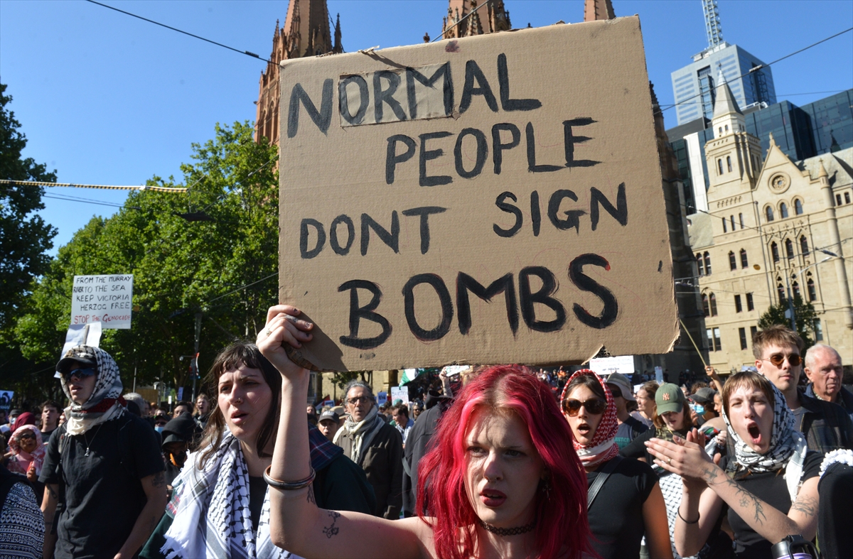 People gather outside Flinders Street Station to protest against Israeli President Isaac Herzog’s visit following his arrival in Melbourne, Australia on February 12, 2026