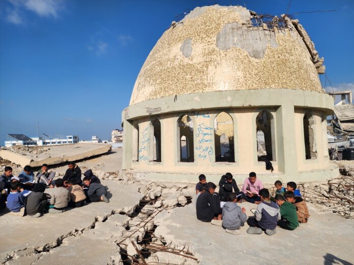 Palestinian children read the Quran at the heavily damaged Al-Habib Mohammed Mosque, destroyed in Israeli attacks, as they wait for iftar during the holy month of Ramadan in Khan Yunis, Gaza. Picture: Anadulo Agency