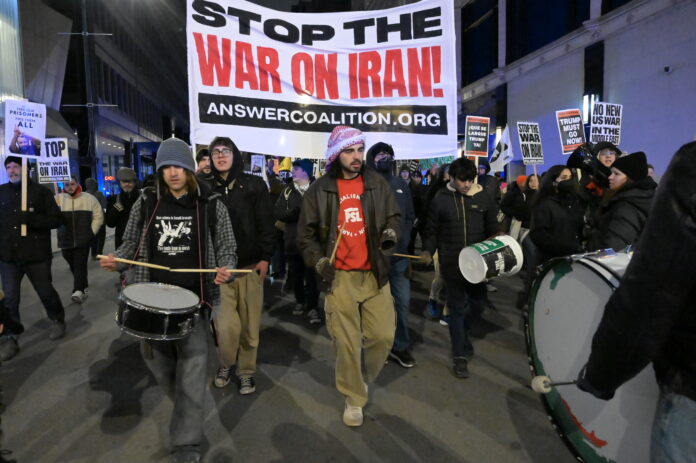 Protesters gather at Federal Plaza on February 28, 2026, in Chicago, Illinois, to demonstrate against the joint US and Israeli military operation in Iran. Following news of "Operation Epic Fury," hundreds of activists and community members converged at the corner of Adams and Dearborn Streets before marching through the streets of downtown Chicago. Participants carried signs calling for an end to military intervention and criticising the administration's bypass of Congressional authorisation. Picture: Jacek Boczarski - Anadolu Agency