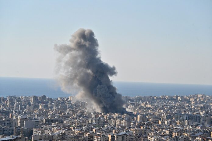 Smoke rises over buildings following intense airstrikes targeting the Burj al-Barajneh area in southern Beirut Lebanon, on March 2, 2026. - AA