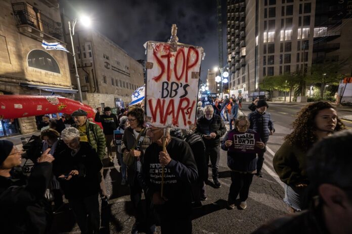Protesters raised slogans criticising the government’s handling of captives who were held in the Gaza Strip, and called for the protection of judicial independence amid Supreme Court deliberations on an investigation into the failures that led to the October 7 attack.